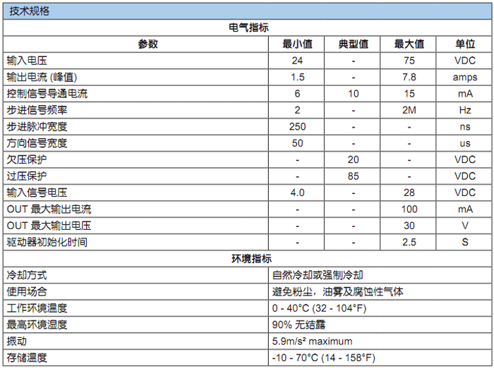 • 3个数字输入口:脉冲/方向/使能信号, 5-24VDC, 光电隔离